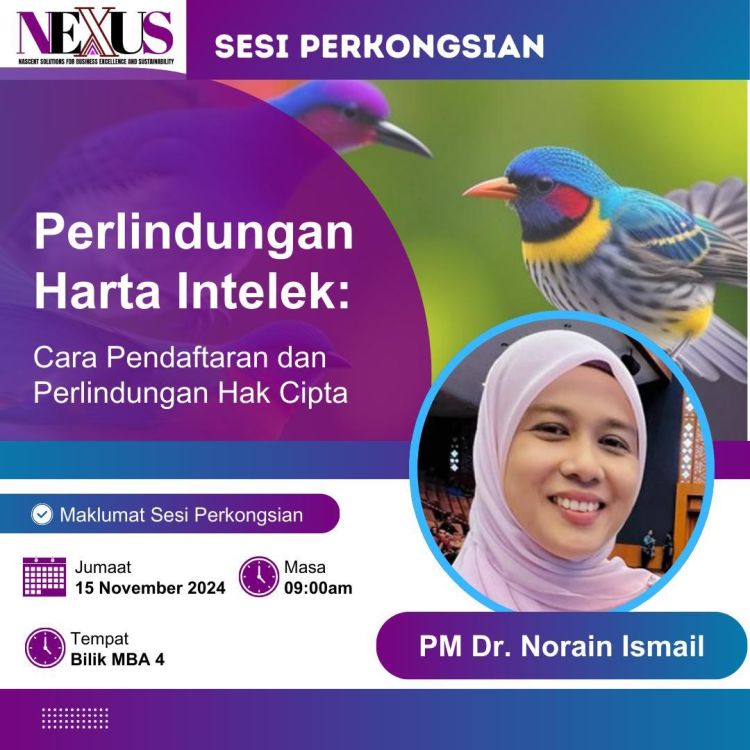 Pada 15 November 2024 (Jumaat), Research Group NEXUS telah menganjurkan satu sesi perkongsian dalaman bertajuk "Perlindungan Harta Intelek: Cara Pendaftaran dan Perlindungan Hak Cipta" yang dikendalikan oleh PM Dr. Norain Ismail.