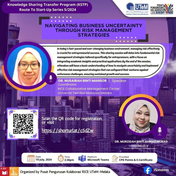On 10 July 2024, the Pusat Pengurusan Kolaborasi RICE UTeM–Melaka successfully hosted the fifth session of the Route To Start-Ups Series 2024, titled "Navigating Business Uncertainty Through Risk Management Strategies".