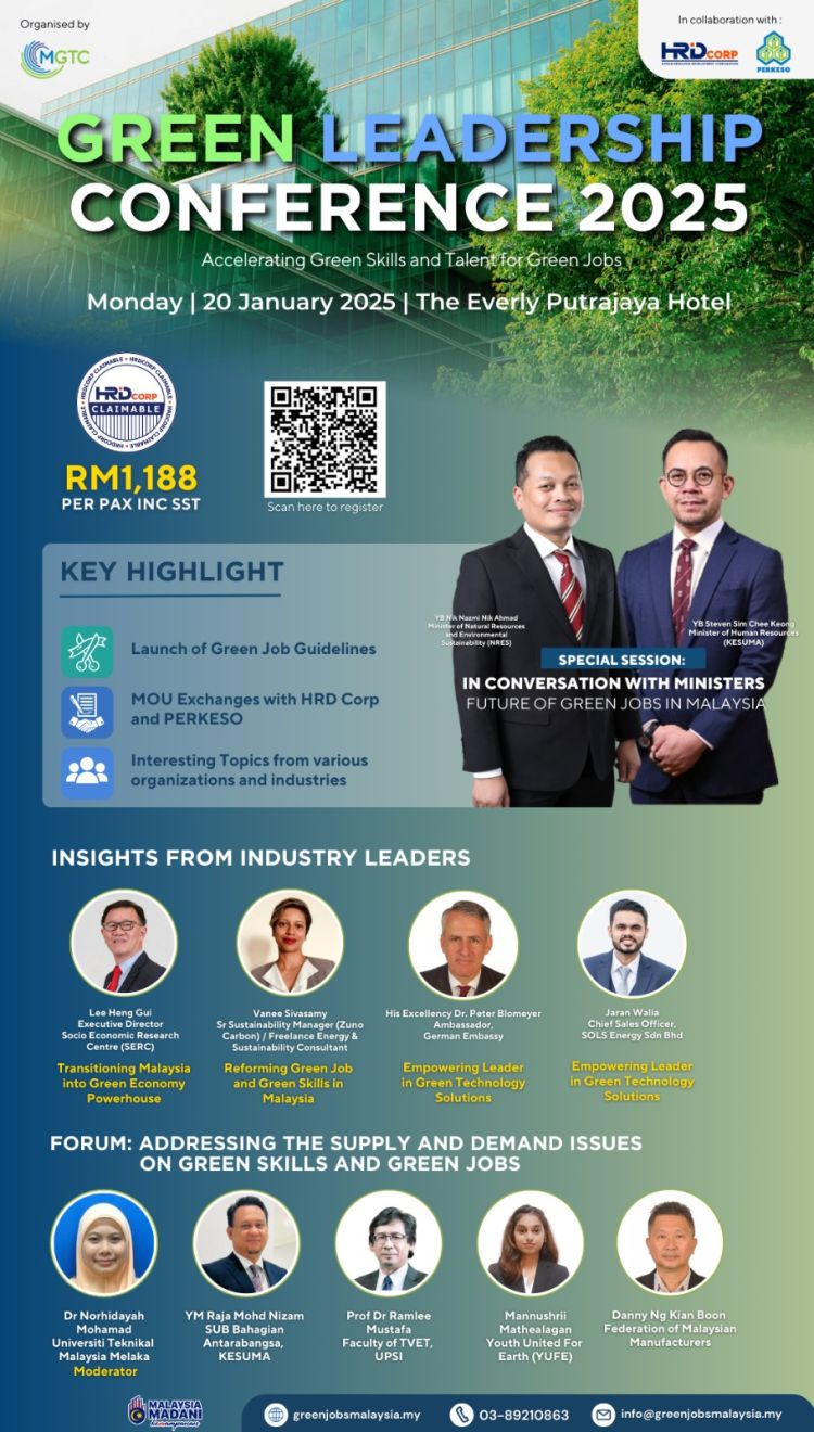 The Green Leadership Conference 2025, organized by MGTC in collaboration with HRD Corp and PERKESO, is set to take place on Monday, 20 January 2025 at The Everly Putrajaya Hotel. With the theme "Accelerating Green Skills and Talent for Green Jobs," this premier event will bring together key stakeholders, policymakers, and industry leaders to shape Malaysia's green workforce agenda.